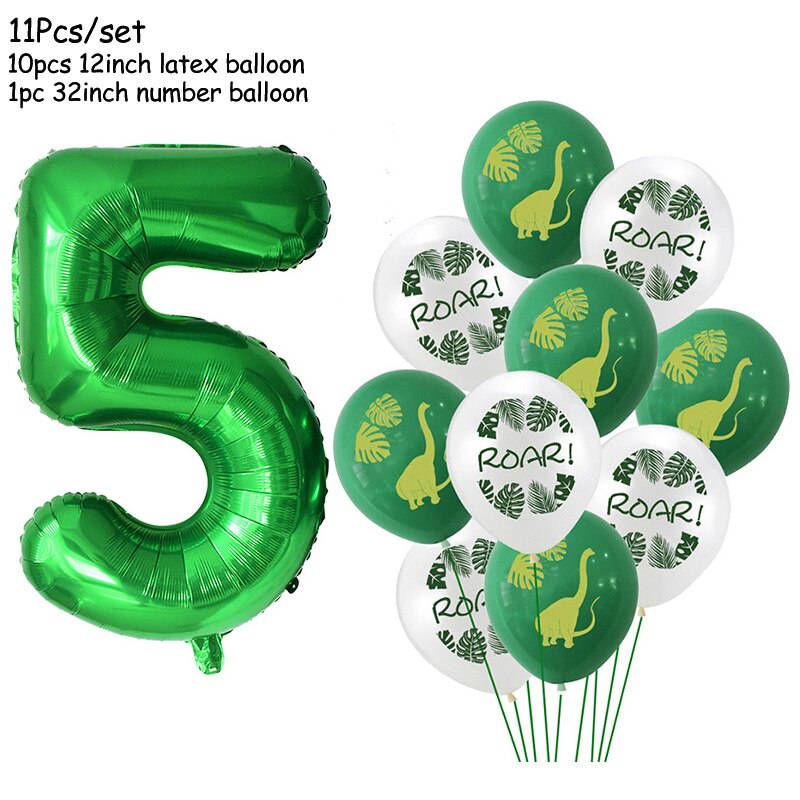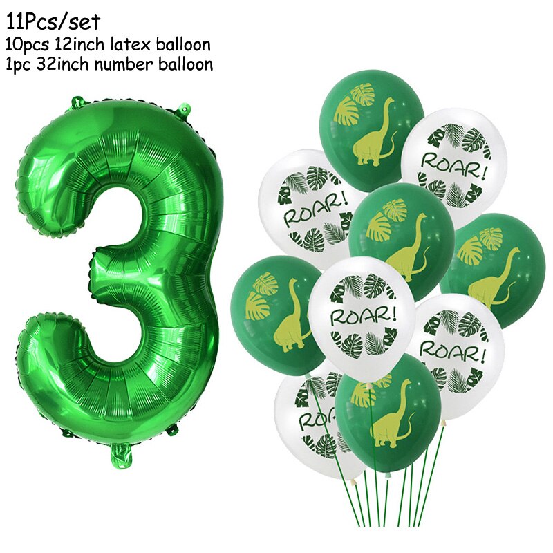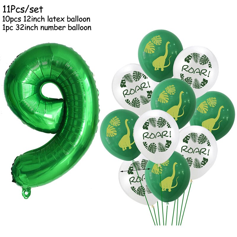 11Pcs Green Foil Number Balloons Dinosaur Latex Balloon Kids Jungle Theme Birthday Safari Forest Party Decorations Baby Shower